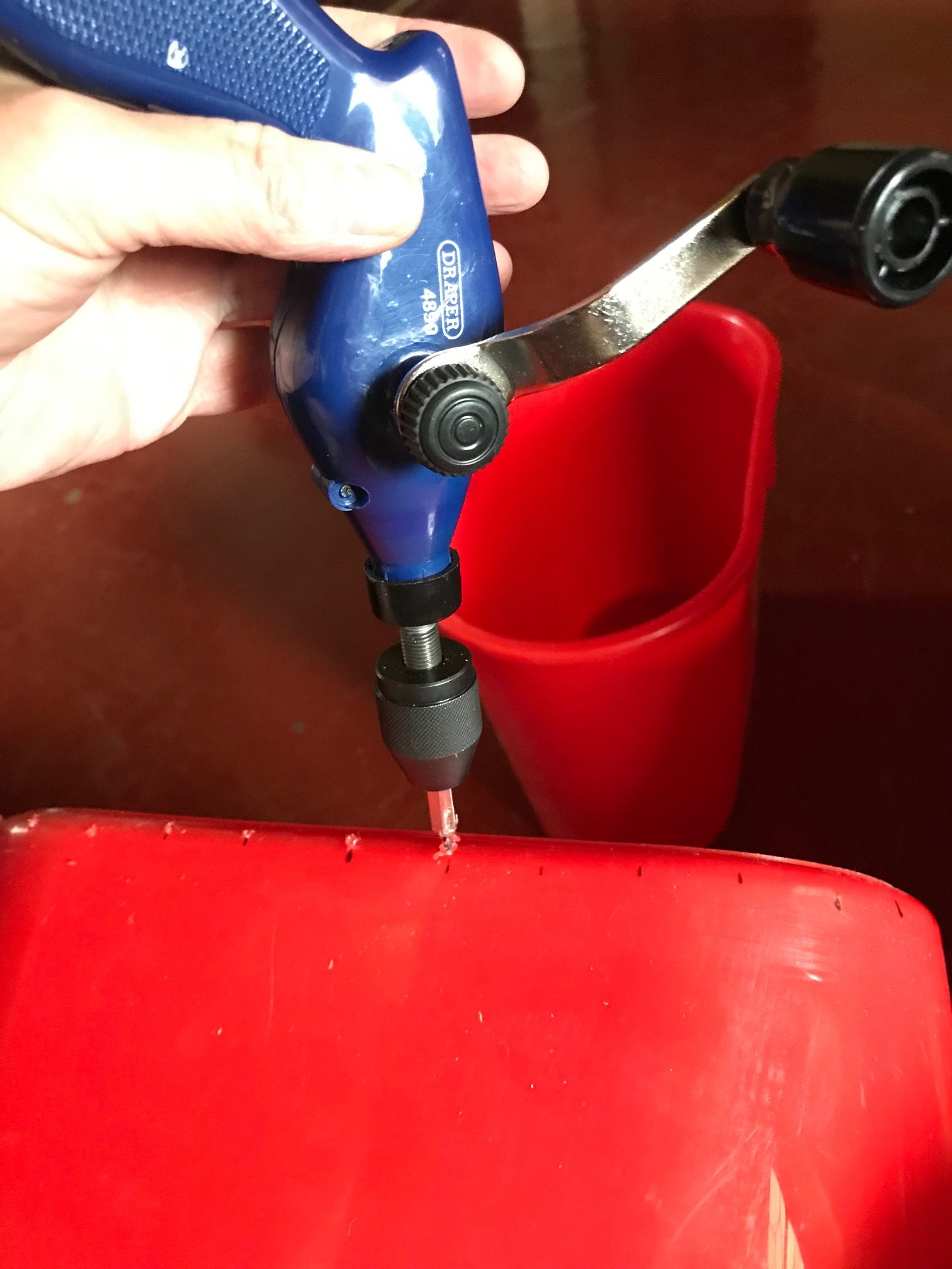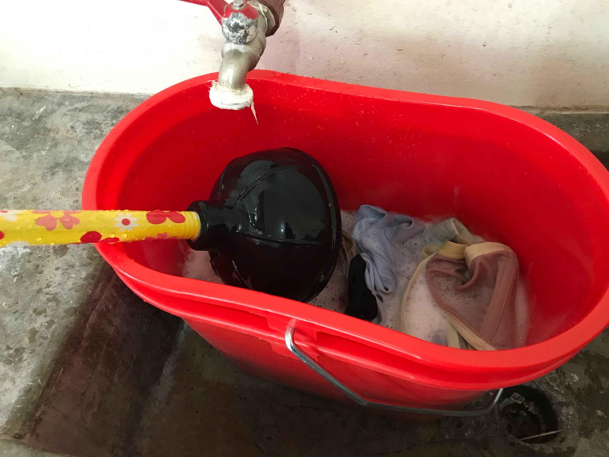So, this laundry system is pretty slick. I bought two new cleat mop buckets that telescope inside each other and have sturdy metal handles. I hand drilled (yes, I bought and brought a small hand drill just for this purpose) many holes in one of the buckets.