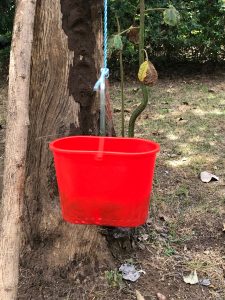 The final step is tying the sturdy handle to a rope I threw over a tree branch in the back yard and twisted the bucket many, many times. Then the unwinding causes centrifugal force for a spin cycle, as water sprays out of the sieve bucket. A few times twisting and spinning gets most of the water out and saves the handwringing of each article of clothing! Now, hang up the clothes to dry.